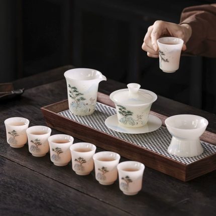 Elevate your tea experience with our Ice Jade ‘Asking Pine’ Gaiwan Tea Set Gift Box – Jade Porcelain Decal Design,