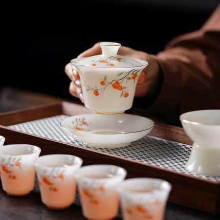 Ice Jade ‘Hundred Treasures’ Gaiwan Set – Translucent Thin-Walled Jade Porcelain, Office & Home Guest Tea Set