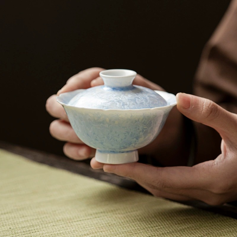 Crystalline Blue Kiln-Changed Ceramic Flower Rim Two-Piece Gaiwan – Premium Home Gongfu Tea Set, Fresh Design Single Cup